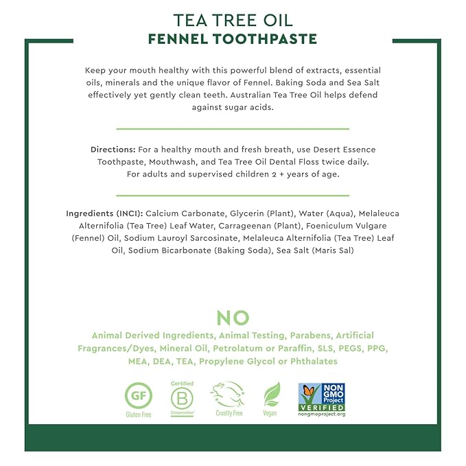 Desert Essence Tea Tree Oil & Fennel Toothpaste, 6.25 oz - Fluoride Free, Gluten Free, Vegan, Non-GMO - Oral Care with Baking Soda & Sea Salt for Healthy Teeth & Gums, Fresh Breath