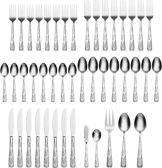 - WHAT'S IN THE BOX: Includes a 45-piece flatware set for 8 people, plus a 5-piece serving set. Each of the 8 flatware place settings includes a dinner fork, salad fork, dinner knife, dinner spoon, and teaspoon. Serving set includes a serving spoon, pierced serving spoon, sugar spoon, butter knife, and serving fork.