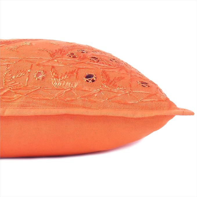 Eyes of India Embroidered Decorative Boho Throw Pillow Cover with Mirrors, Handmade Bohemian Accent Cushion Case for Sofa Couch Bedroom Living Room (Orange, 16" x 16")