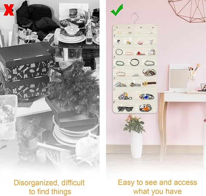 - 2 VERSIONS TO CHOOSE FROM: In addition to the 50 pockets version, we offer an alternative hanging jewelry organizer with 25 transparent pockets and 23 Hooks! Choose whichever fits you and put all your rings, earrings, lockets, necklaces, watches, brooches, pins and other jewelry in order!