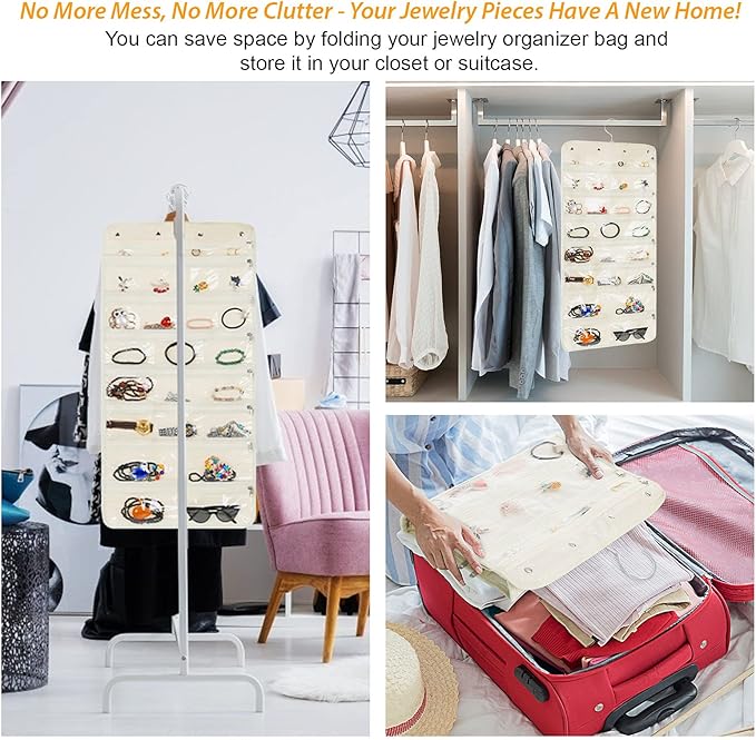 - 360 degree rotational hanger and Secure Zipper Closure, Never have to worry your jewelries ever fall down again and browse its pockets and loops easier than ever.