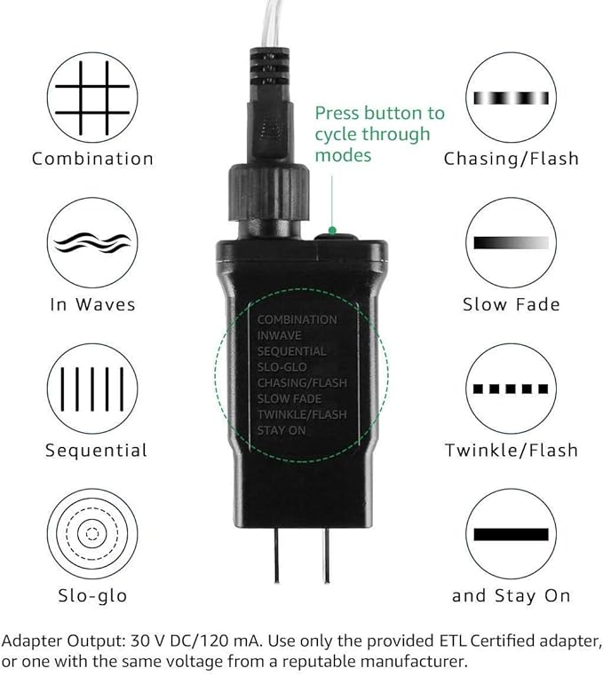 - 7 Changing Modes and 1 Steady On Mode: Press the button on the transformer to choose from the 8 different light effects: Combination, In Waves, Sequential, Slo-glo, Chasing/Flash, Slow Fade, Twinkle/Flash, and Steady On.
