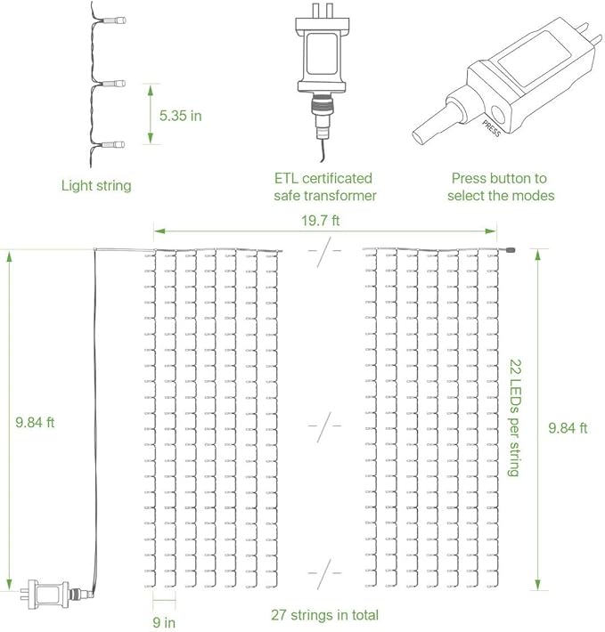 - 19.7 ft * 9.84 ft Super Bright Icicle Lights: The daylight white 594 LED waterfall fairy lights is 2 or 3 times the width of others. It is wide enough and quite perfect to hang across most of walls, use as birthday party, wedding reception, and head table backdrops, or just wrap it around a canopy bed or pergola in the backyard. Note: It cannot be cut or connected with another set