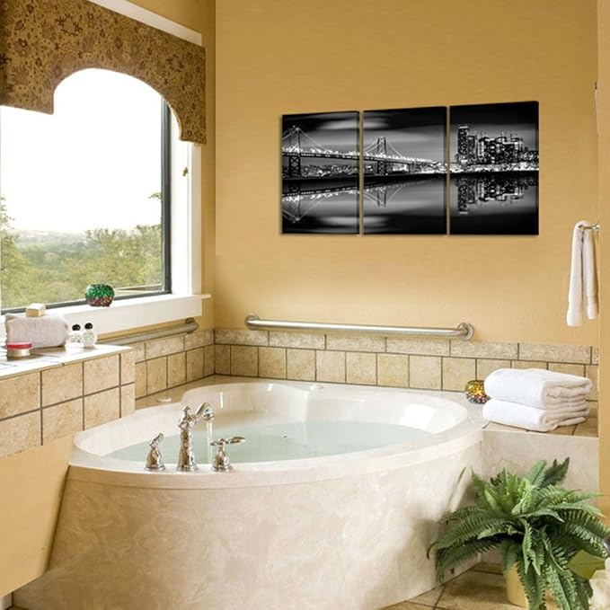 KREATIVE ARTS - San Francisco Bay at Night in Black and White Bridge 3 Panels Modern Landscape Artwork Canvas Prints Cityscape Pictures Paintings on Canvas Wall Art for Home Decor (12x16inchx3pcs)
