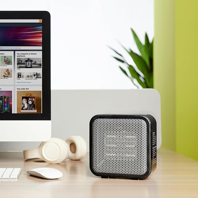 Amazon Basics Ceramic Space Heater, Mini Heater for Office Desk, Portable Tent Heater for Camping (Indoor Use), 500 W, With Tip-Over Protection, Lightweight (1.4 LBS), Black, 5.87”D x 3.15”W x 5.95”H