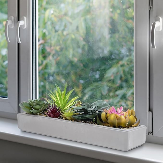 - Beautiful potted arrangement of artificial succulents displayed in a 15-inch rectangular cement gray modern planter, perfect for indoor use