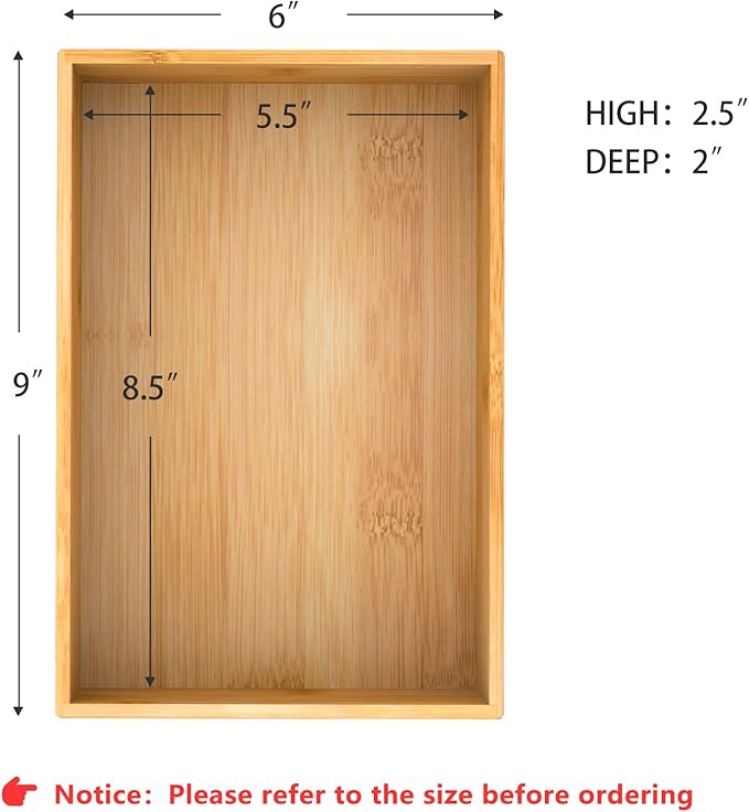 - 【Multi-functional Storage Box】 This deep bamboo organizer boxes are good for organizing items, such as forks, spoons, and knives in kitchen; brushes, soap dispenser and toilet paper in bathroom; cosmetics, makeup tools and hair accessories in makeup room; documents, pens and paper clips in office. Try this bamboo storage box organizer - ending clutter in your office desk and kitchen drawer.