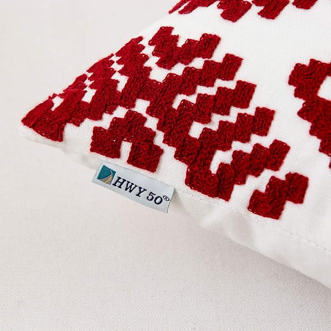 HWY 50 Red Decorative Throw Pillow Covers 18x18 Inch, Pack of 2 Embroidered Cotton Farmhouse Cushion Cover Pillow Case for Sofa Couch Living Room Bed Bedroon, Diamond Design