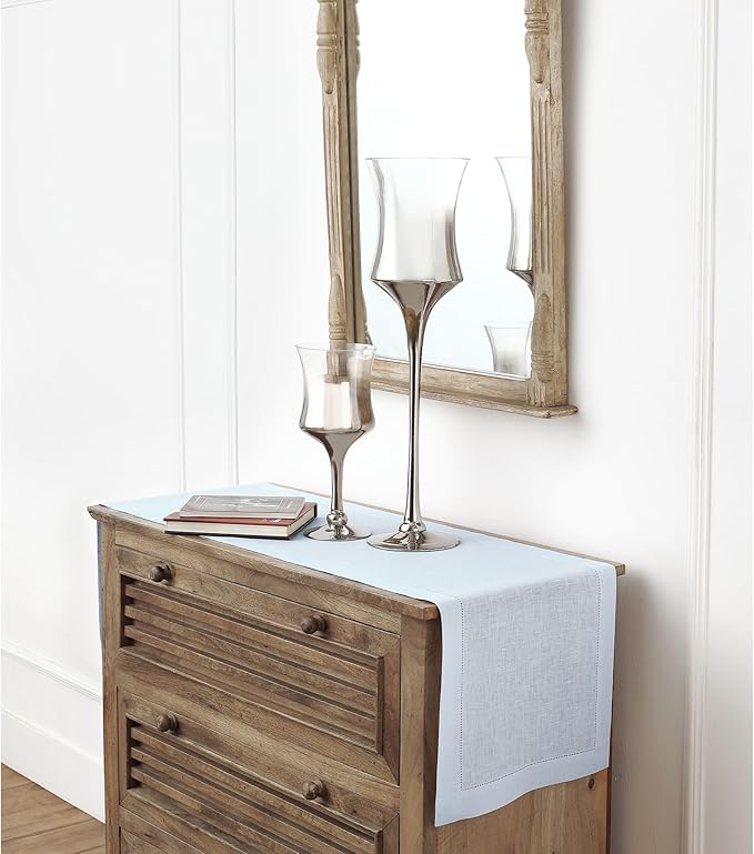 Solino Home Linen Light Blue Table Runner 36 Inches - Classic Hemstitch, 100% Pure Linen Coffee Table Runner 14 x 36 Inch Ideal for Dresser Tables