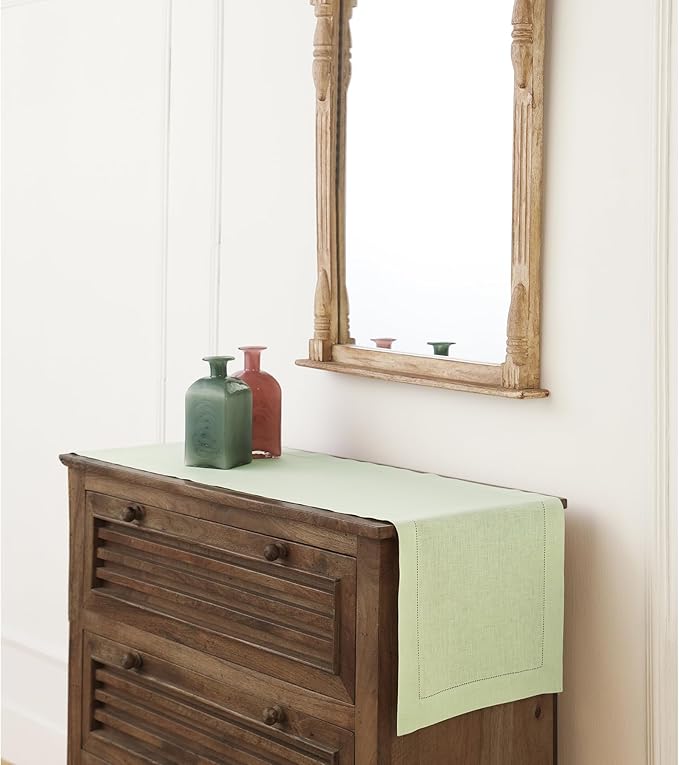 Solino Home Linen Table Runner 36 Inches - 100% Pure Linen Sage Green Hemstitch Table Runner 14 x 36 Inch Ideal for Dresser and Coffee Tables - Fall, Autumn, Thanksgiving - Classic Hemstitch