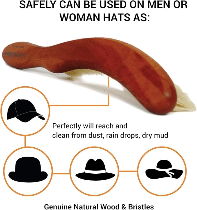 - ⚜️ INTENDED FOR ALL TYPES OF HATS – this 9 inch long cleaning hat was created to serve the owners of any type of hats regardless style or materials made. It will maneuver easily and will eliminate thoroughly any accumulations from leather or textile materials. Safely can be used on men or woman hats as: sun hats, baseball caps, flat caps, newsboy, fedora, trilby, pork pie hat, homburg hats, Panama hat, derby hats. Or just use it on western hats, stockman hats and even trapper hat or stormy kromer