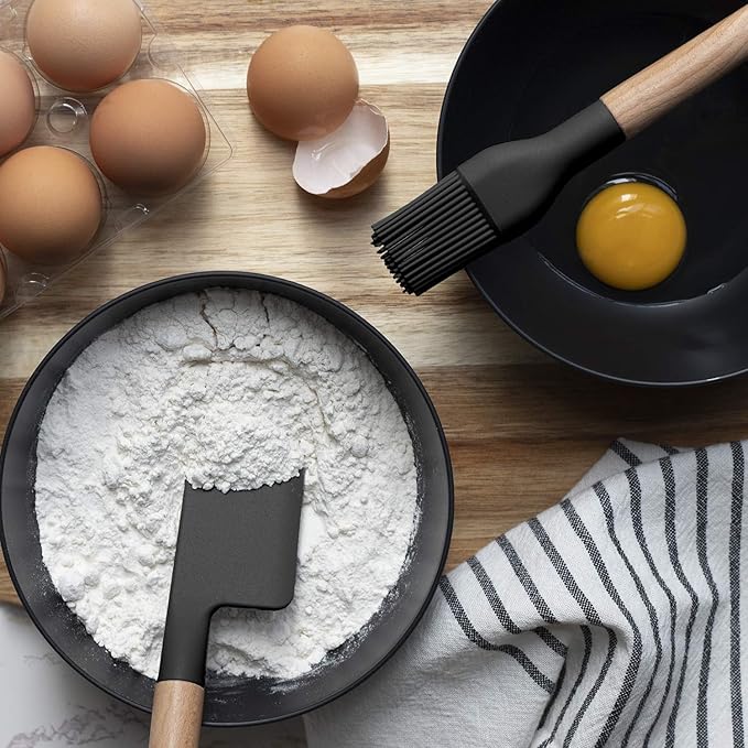 - Equip your Kitchen with all the essential baking tools and cook, bake, and serve with fun and fashion at the same time, this colorful and stylish set features black silicone utensils with easy to grip wood handles. Hand wash recommended. BPA free; heat resistant up to 450° F. Hand wash only.