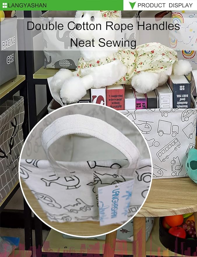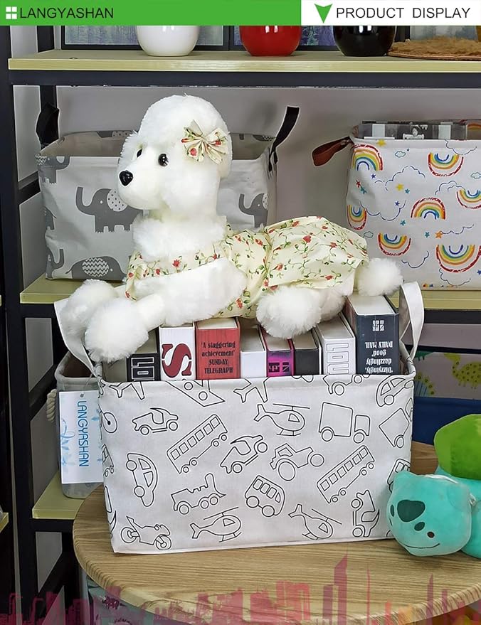 LANGYASHAN Rectangular Storage Bin Collapse Canvas Fabric Cartoon Storage Basket with Handles for Organizing Home Kitchen Boys and Girls Toys Office Closet Shelf Baskets (Rec Vehicle)
