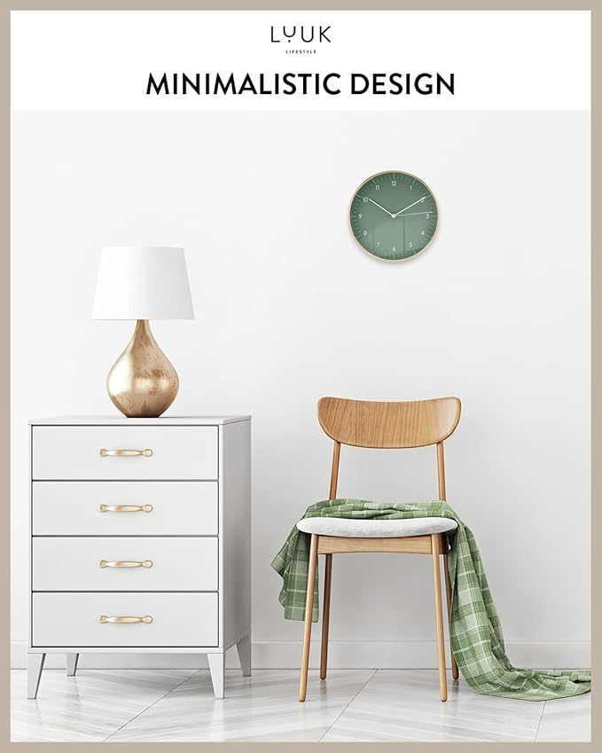 - SILENT MOVEMENT: This non-ticking quartz wall clock, beautifully crafted in a rich dark green color, comes with a second hand and embodies a minimalist, Scandinavian design; The Arabic numerals are readable from a distance