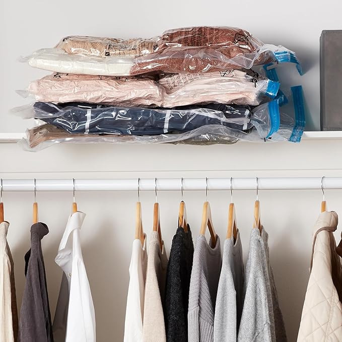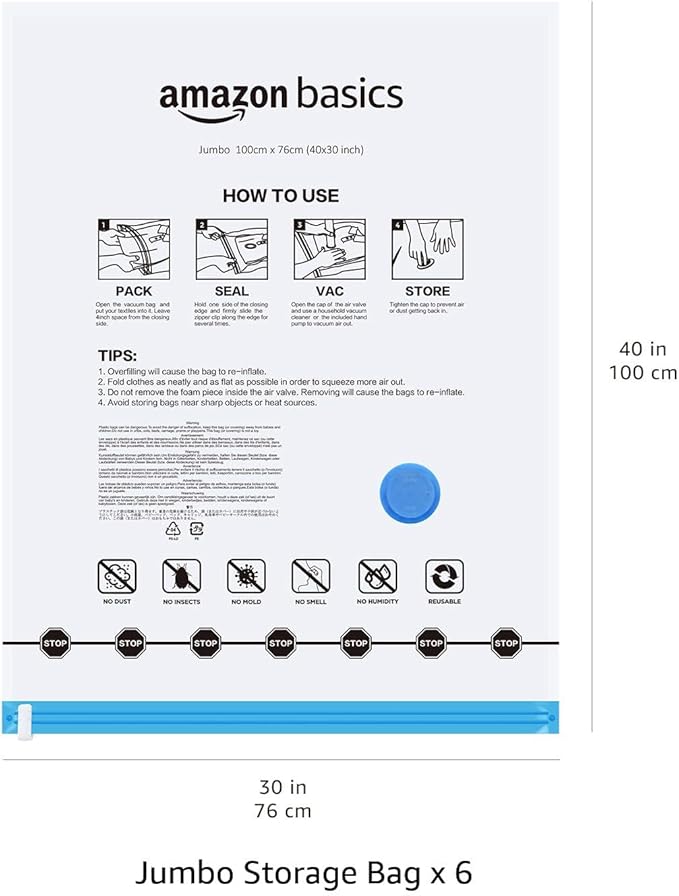 Amazon Basics Vacuum Compression Space Saving Storage Bags with Hand Pump for Clothes Packing, Jumbo, Clear, Pack of 6