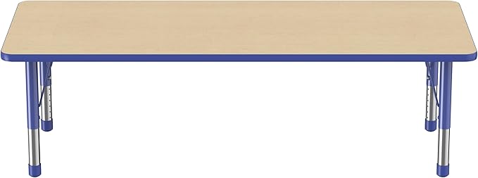 FDP Rectangle Activity School and Classroom Kids Table (30 x 72 inch), Chunky Toddler Leg, Adjustable Height 15-24 inches - Maple Top and Blue Edge