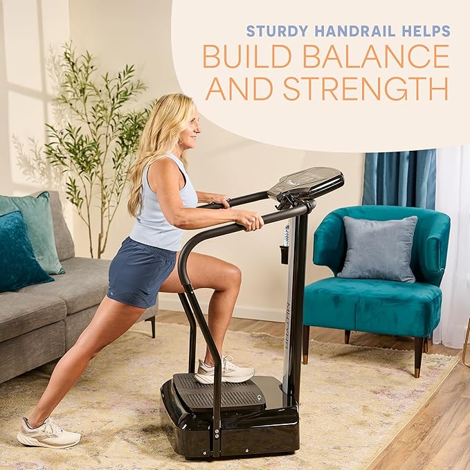 - MONITOR & IMPROVE: Use this shake plate exercise machine daily to build strength and balance over time. Studies suggest that long-term use of vibrating plates can improve flexibility and range of motion. Use the built-in handles to maintain balance and monitor your heart rate as you improve.