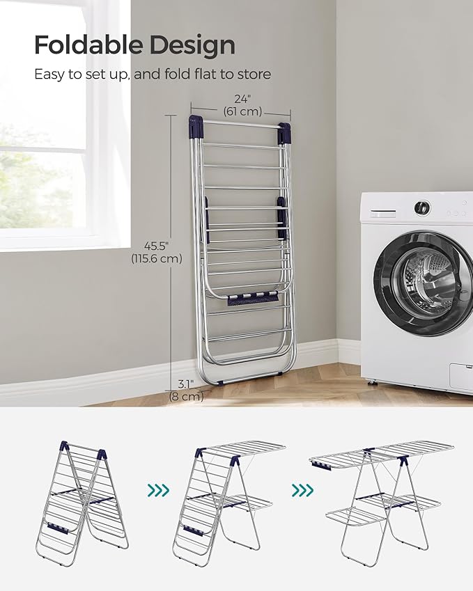 SONGMICS Clothes Drying Rack, Foldable 2-Level Laundry Drying Rack, Free-Standing Laundry Airer, with Height-Adjustable Wings, 33 Drying Rails, Sock Clips, Silver and Blue ULLR53BUV1
