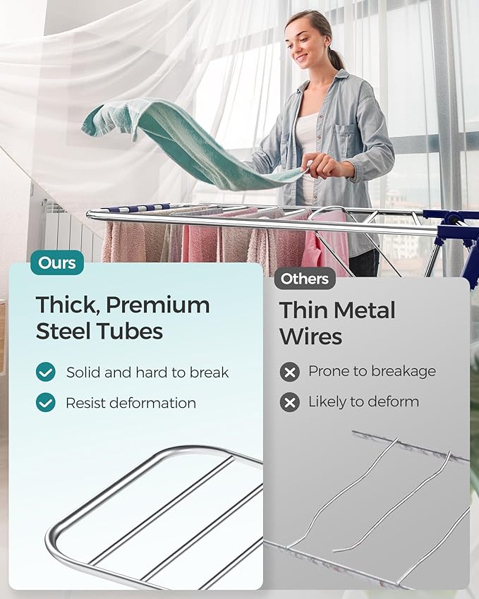 - Water and Rust-Resistant: Boasting thick steel tubes with a specially treated finish and durable plastic connectors, this laundry drying rack is water and rust-resistant. So feel free to hang your wet laundry on!