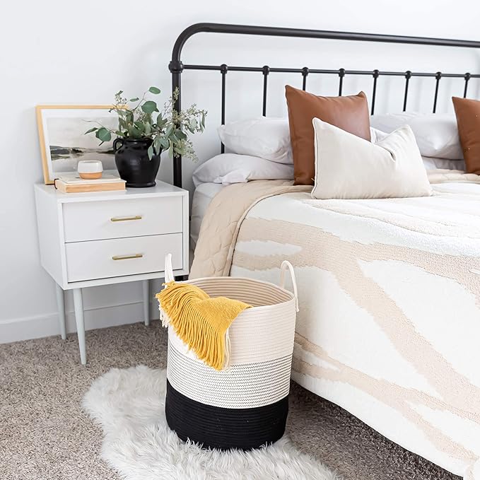 OrganiHaus Black & White Blanket Storage Basket for Living Room 15x18, Woven Nursery Hamper Basket, Large Toy Basket Storage for Kids, Laundry Hamper, Baby Laundry Basket, Cute Cotton Rope Basket