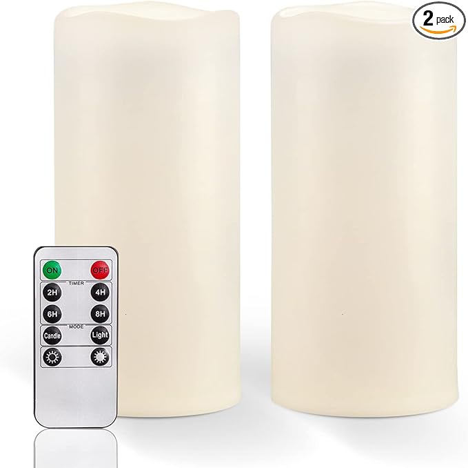 - Package Include: 2 x large outdoor flameless candles (8” in height and 4” in diameter), 1x 10-key remote control, and a user manual. Any question just contact us by clicking the “contact seller”.