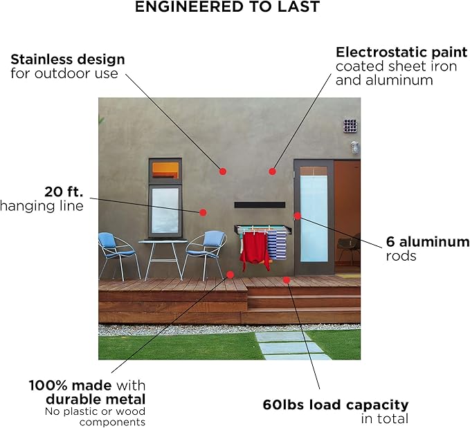 - LARGE DRYING SPACE & HEAVY WEIGHT CAPACITY: Our foldable laundry drying rack features 6 heavy-duty aluminum rods with 20 feet of linear hanging line and can hold up to 60 lbs weight.