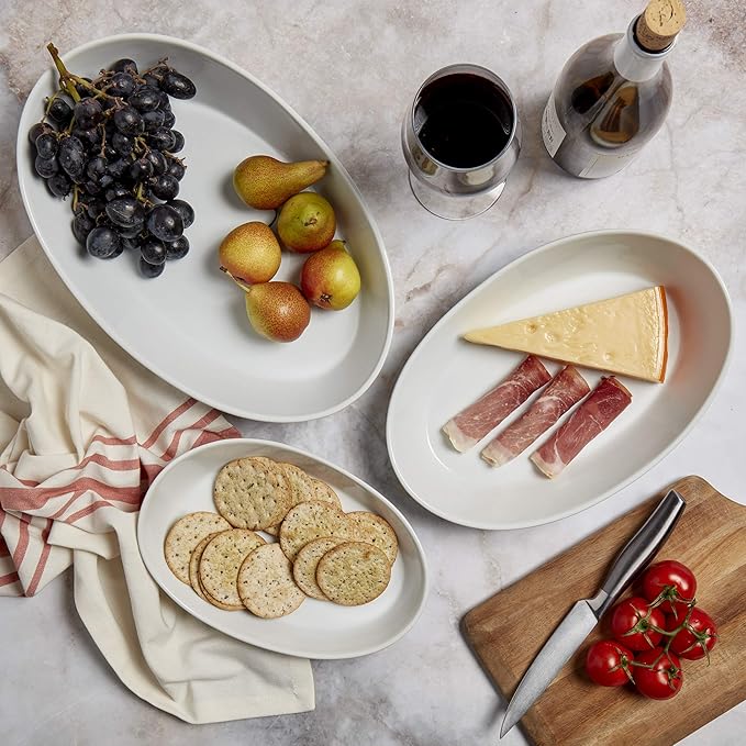 - CLASSIC WHITE It's elegant curves and smooth glossy textured finished in a natural white provides a timeless look which will look great for years to come. This set comes as a set of 3 generously sized Oval shaped serving bowls; Small- 9"L x 6"W, Medium- 11"L x 7.4"W, and Large- 13"L x 8.75"W.