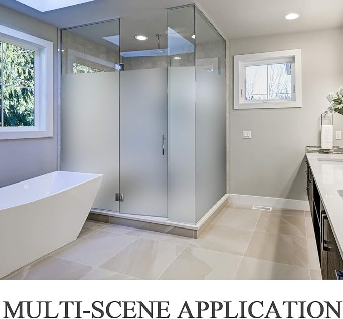 - ECONOMICAL FOR MULTI-SCENARIOS: No need to use heavy and expensive curtains or blinds, the glass frosting film is suitable for any FLAT, CLEAN, and SMOOTH glass door, window surfaces in the Bathroom, Balcony, Living Room, Bedroom, kitchen, balconie, cabinet, office, hotel etc. Note: Double-paned glass, cut glass and all processed glass is not workable for this frosted window film.