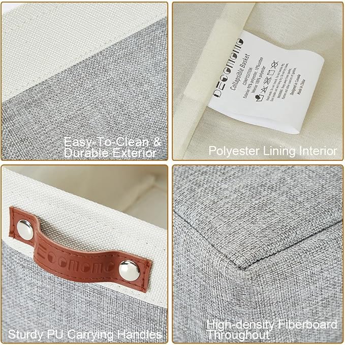 - Durable Design: DECOMOMO's baskets feature a sturdy metal frame, extra thick EVA exterior, polyester interior, 2.5mm MDF fiberboard bottom, and faux leather handles capable of holding up to 15 lbs.
