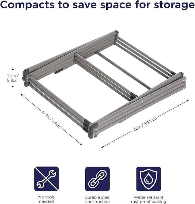- SPACE-SAVING: Portable drying rack, you can easily fold it flat for compact storage in a closet or next to the washing machine, ready and waiting for next time Collapsed Size: 17" x 21" x 3", Partail Expanded Size: 17" x 41" x 21" Fully Expanded: 30" x 41" x 17"