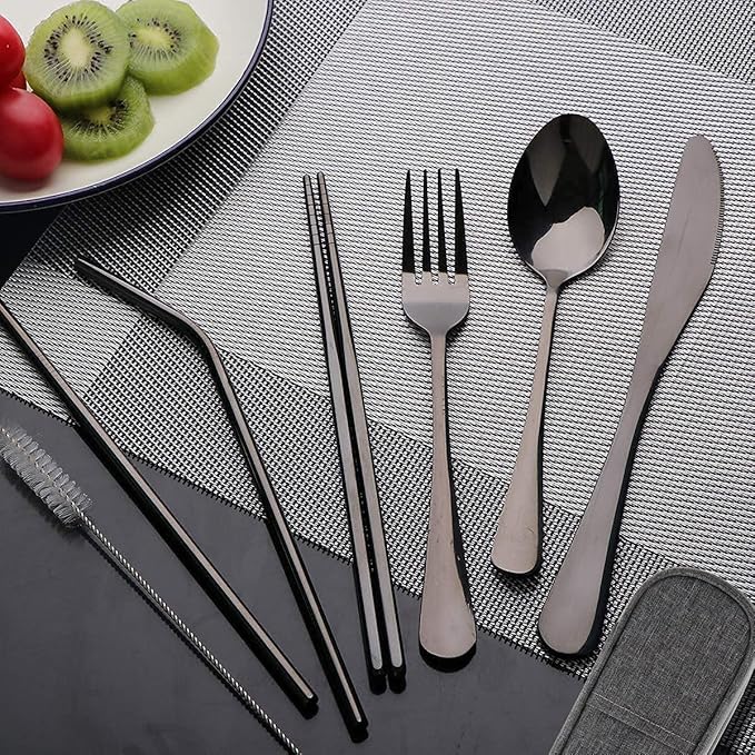- The travel tableware set- includes travel flatware carrying case,full size dinner Knife,fork, spoon, chopsticks, cleaning brush, straws with silicone tips (More comfortable when you use a straw)