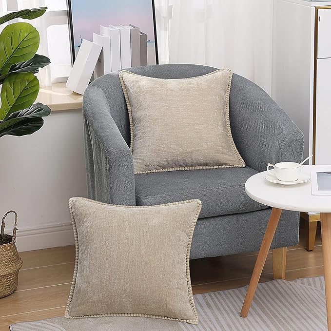 decorUhome Chenille Soft Throw Pillow Covers 18x18 Set of 2, Farmhouse Velvet Neutral Decorative Euro Pillow Covers with Stitched Edge for Couch Sofa Bed Home Decor, Beige