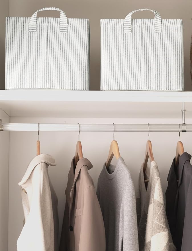 StorageWorks Storage Bins, Fabric Storage Bins for Shelves, Large Storage Baskets with Metal Frame, Closet Baskets and Bins with Handles, Gray and White Stripes, 2-Pack