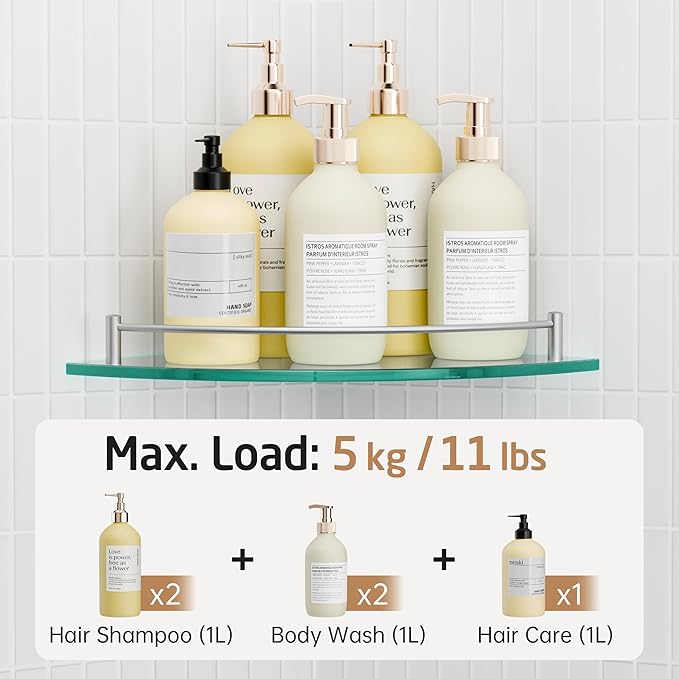 - No Risk of Injury: We use tempered glass on our shower corner shelves. When broken, it will crumble into small granular chunks instead of splintering into jagged shards like plate glass, unlikely to cause injury
