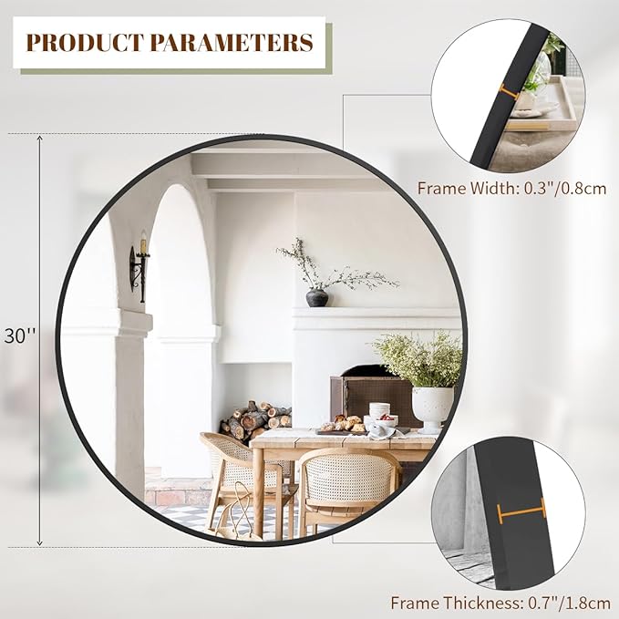 - Modern Brushed Frame Design: 30-inch black circle mirror is crafted of an aluminum alloy metal sleek frame, making it ideal for bathroom mirror, entrance mirror, vanity mirror, living room mirror