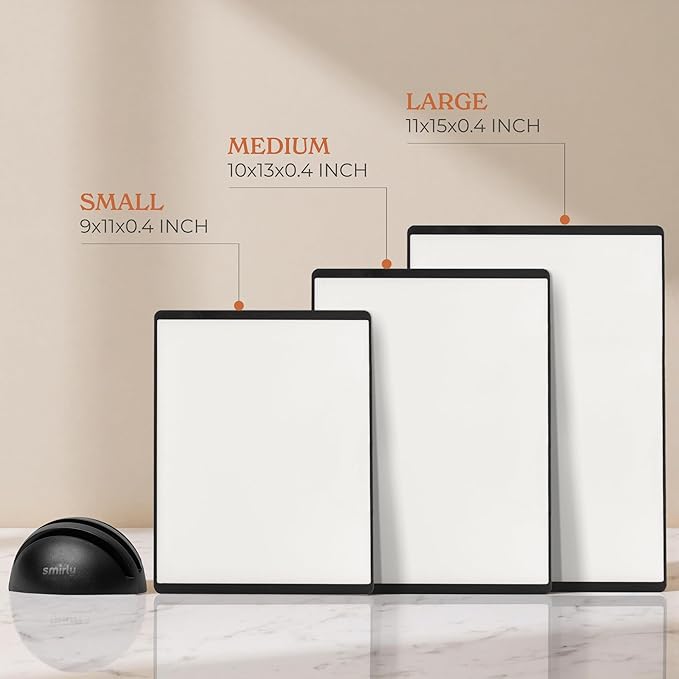 - 3-Pack with Holder: This cutting board set includes small, medium, and large cutting board sizes for every prep need. It also comes with a compact holder that neatly organizes all boards vertically, keeping your countertops clutter-free while ready for any chopping task.