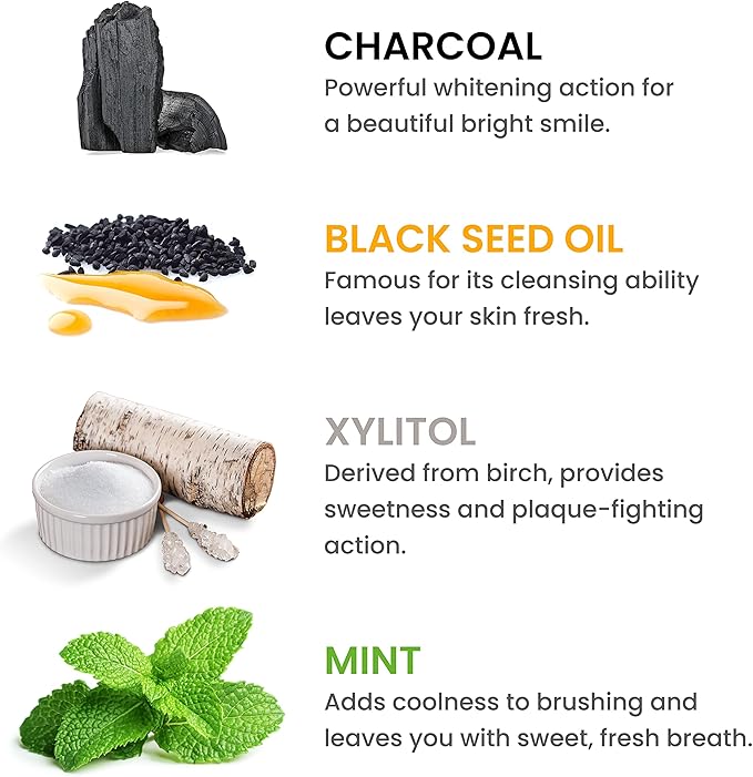 - UNIQUE CLEANING AND PLAQUE FIGHTING INGREDIENTS: Let the powerful whitening action of Charcoal from Coconut Shell powder and the famous cleansing ability of Black Seed Oil leave your mouth feeling fresher and your smile looking brighter.