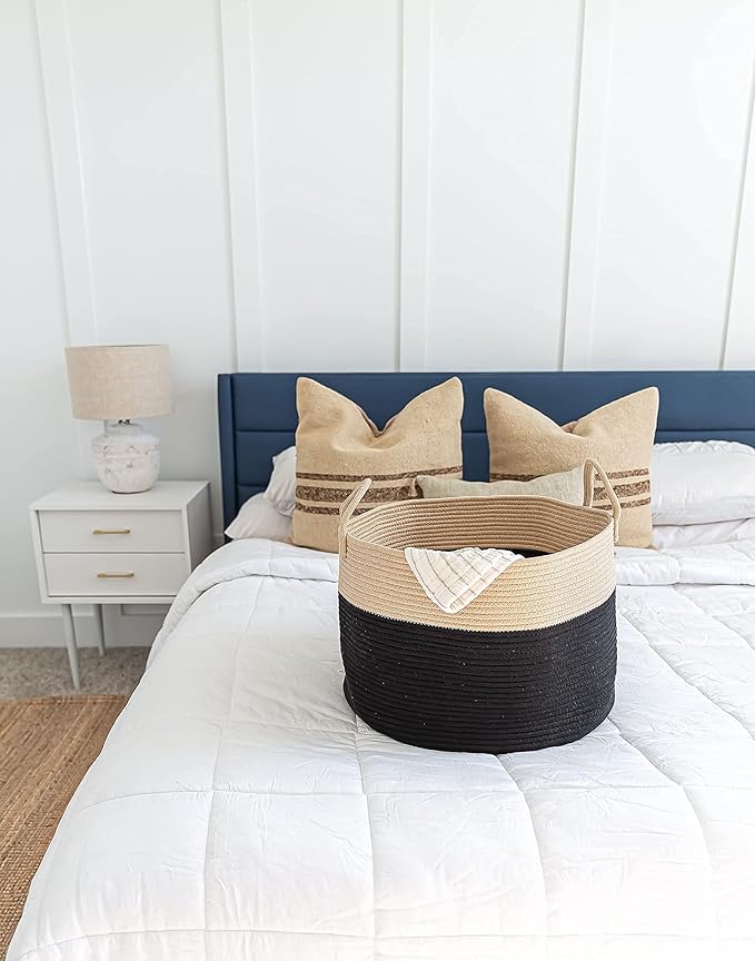 OrganiHaus Woven Laundry Basket, Large Cotton Rope Blanket Holder with Handles, Soft & Sturdy Nursery Hamper, Decorative Toy Bin for Living Room Organization 20x13 inches - Black/Honey
