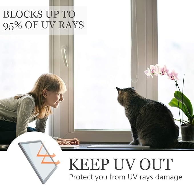 - GLARE CONTROL & UV BLOCKING:This obscured window privacy film offers heat insulation in summer and heat preservation in winter. Blocks out glares and 95% harmful UV rays, thus reduce fading and aging of interior furnishings, also protect our skin from harm.