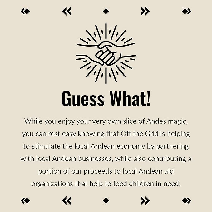 - SOCIALLY RESPONSIBLE: While you enjoy your very own slice of Indian Andes magic, you can rest easy knowing that Off the Grid is helping to stimulate the local Andean economy by partnering with native Andean businesses, while also contributing a portion of our proceeds to local Andean aid organizations that help to feed children in need.