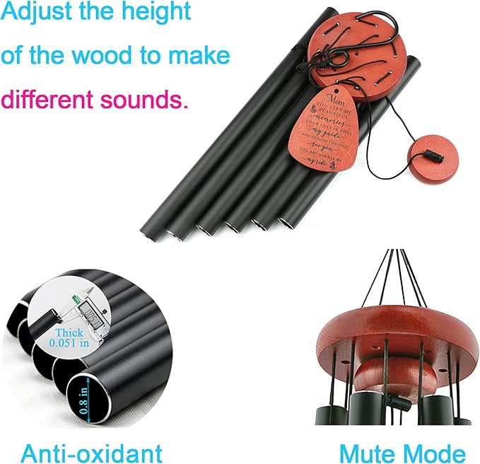 - Premium Quality Memorial Wind Chimes: Made with high-quality aluminum tubes and a corrosion-resistant black anodized finish, these memorial wind chimes produce clear, beautiful tones. The bell holder, striker, and wind catcher are made from durable beech wood, and the entire structure is supported by a strong, weather-resistant nylon cord for lasting outdoor use