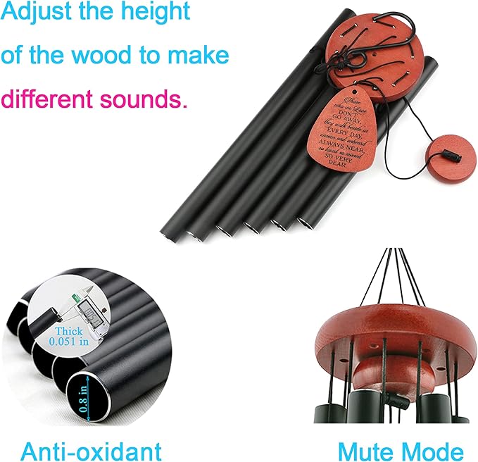- Premium Quality Memorial Wind Chimes: Made with high-quality aluminum tubes and a corrosion-resistant black anodized finish, these memorial wind chimes produce clear, beautiful tones. The bell holder, striker, and wind catcher are made from durable beech wood, and the entire structure is supported by a strong, weather-resistant nylon cord for lasting outdoor use