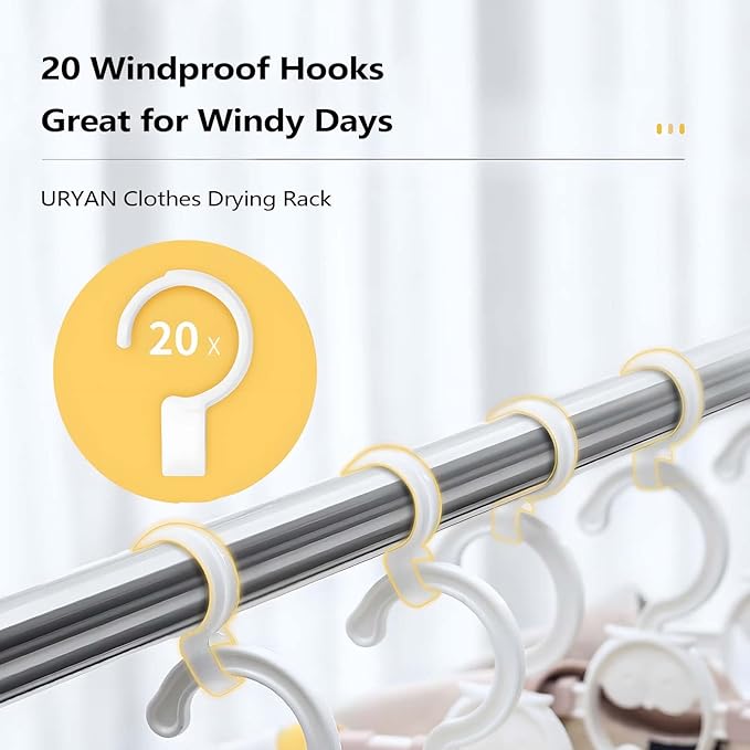 - Rust-Resistant Clothes Line: Made of rust-resistant stainless steel for long-term use. Includes 20 windproof hooks to keep clothes securely spaced, ensuring better airflow and faster, tangle-free drying