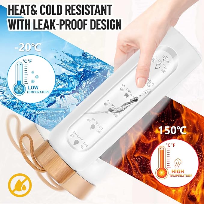- Your Ultimate Hydration Partner: Our clear glass drinking bottle are made of borosilicate glass, which is dishwasher safe, leak proof, BPA, BPS, PVC, lead, and cadmium free. These durable and aesthetic reusable glass time water bottles will not crack under extreme temperature and pressure