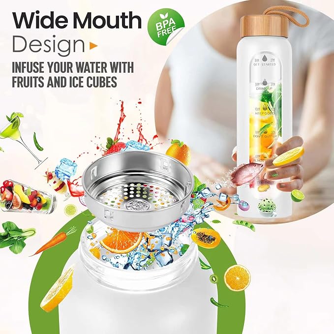 - Functional Design: The wide mouth of the fruit water bottle infuser makes it easy to wash with a retractable bottle brush; we've attached a strap to the lid of the hourly time 32 ounce water bottle tracker so you can conveniently carry and refill it for daily goal tracking