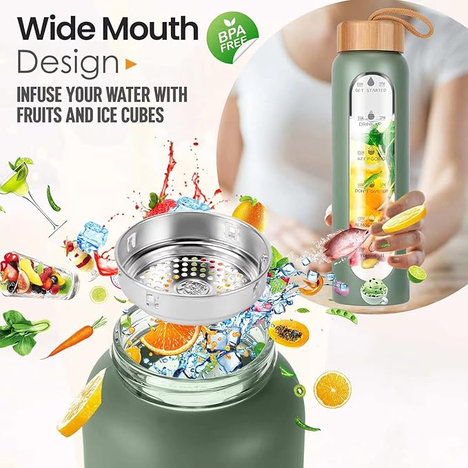 - Innovative and Convenient: The Aqulea wide mouth water bottle glass package comes with a leak-proof glass bottle with bamboo lid, a non-slip protective silicone sleeve for easy grip and maximum impact protection, an 18/8 stainless steel strainer for infusion water bottle, and a retractable brush