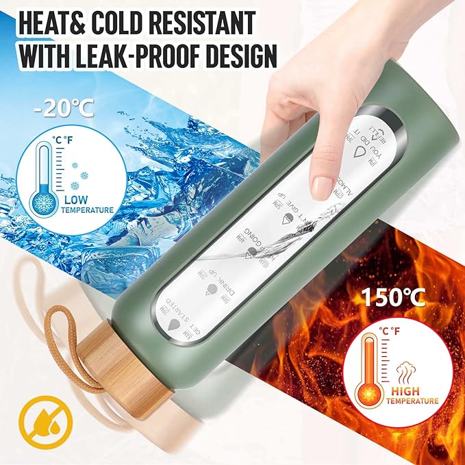 - Your Ultimate Hydration Partner: Our clear glass drinking bottle are made of borosilicate glass, which is dishwasher safe, leak proof, BPA, BPS, PVC, lead, and cadmium free. These durable and aesthetic reusable glass time water bottles will not crack under extreme temperature and pressure