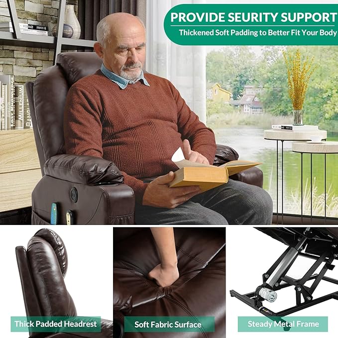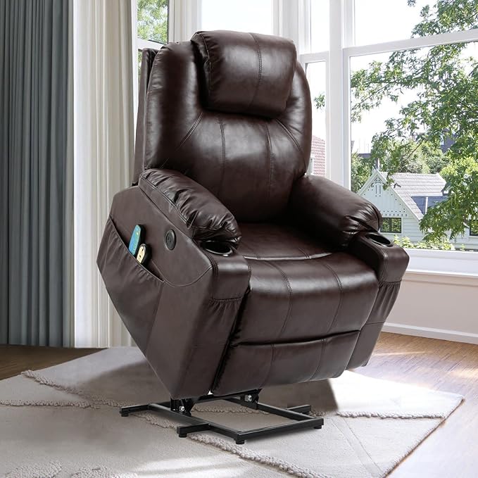 VIVIJASON Power Lift Chair Electric Recliner for Elderly Heated Vibration Massage Faux Leather Recliner Chair with 2 Remote Controls, Cup Holders, Side Pockets & USB Ports for Living Room (Brown)