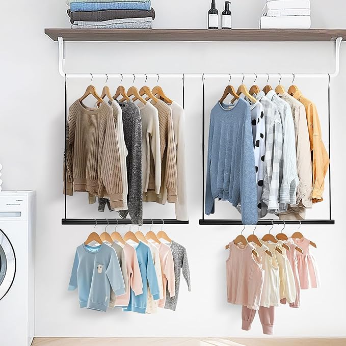 - 【Saving More Closet Space】The adjustable hanging closet rod is suitable for all wardrobes with horizontal bars and can also be used as a kids closet organizer, help your child gain more independence by easily reaching their clothes and choosing what to wear.