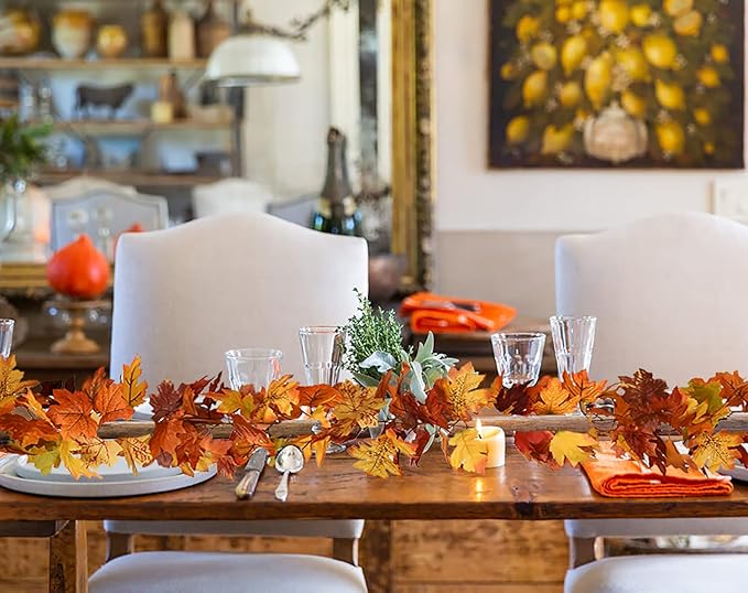 - 【Realistic Fall Leaves Garland】The 7 colors of the maple leaves range from dark green to vibrant orange, look like the real fallen leaves, making for a great blend of colors to warm up any room. Perfect festival decorations for indoor or outdoor.
